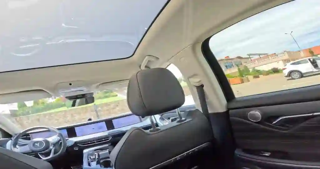Благодаря электрической платформы у автомобиля ровный пол. Над головой - панорамная крыша. Она роскошно велика и в своем классе не имеет конкурентов. При этом у нее есть и еще одна приятная особенность. А именно - электрохромное стекло, которое меняет свою прозрачность, или правильнее поляризацию, в зависимости от выбранного режима. И если затемнение включено, то без особых проблем можно смотреть сквозь него на солнце. Если нет, то возникает ощущение нахождения в кабриолете с идеальной аэродинамикой.